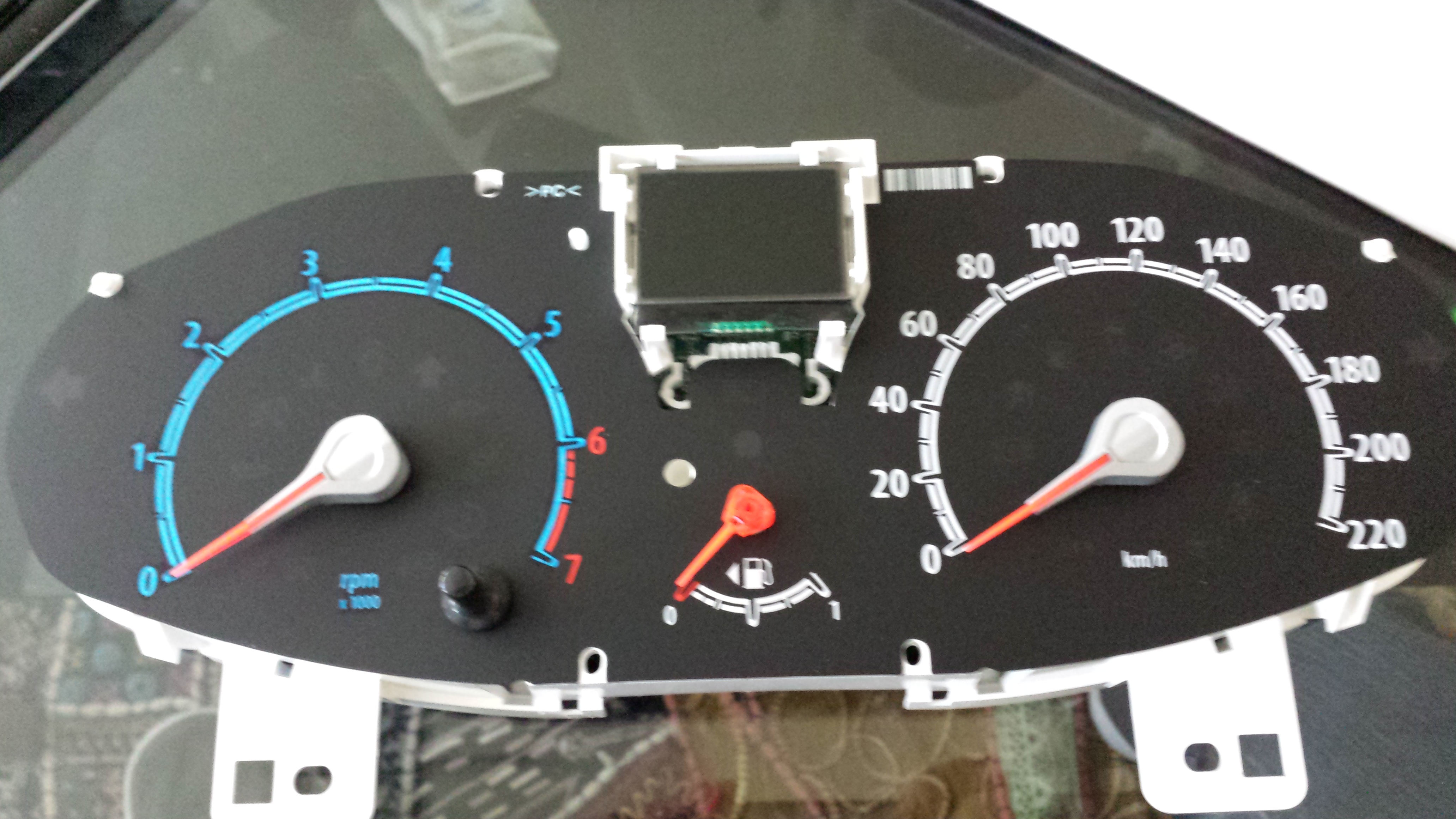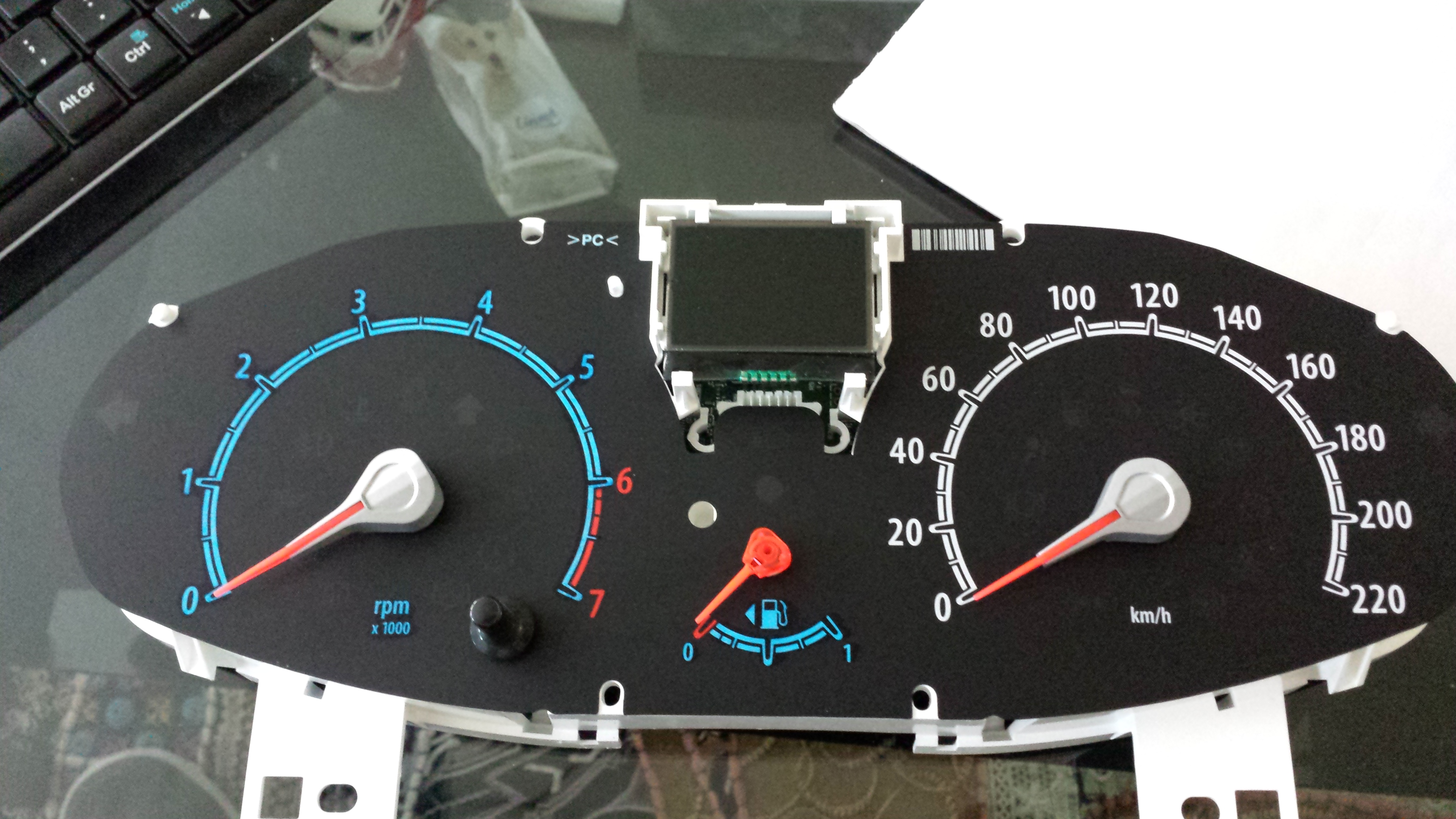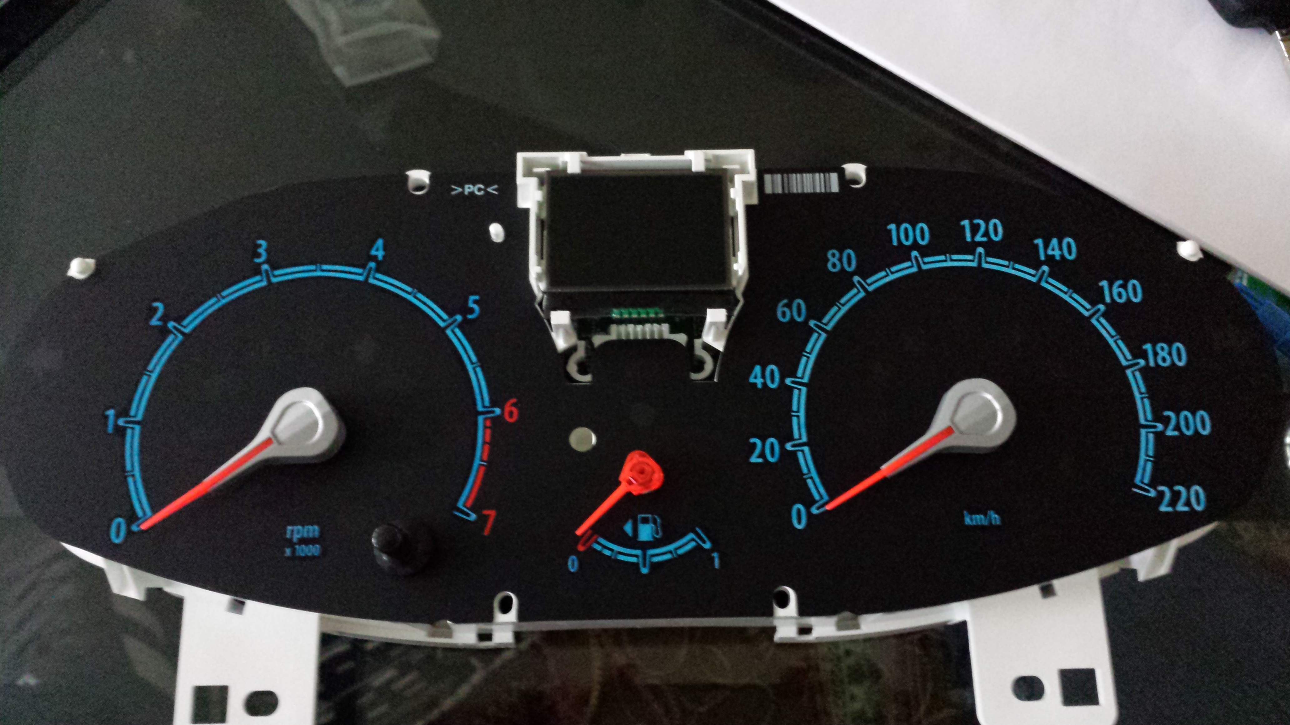Das Anzeige-Blatt des Anzeigeinstruments kann man nicht vom Board entfernen, jedoch kann man simpel eine blaue Folie dahinter klemmen oder - so wie ich es gemacht habe - mit einem blauen Edding-Stift das weisse ausmalen.